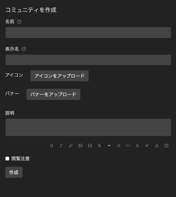 また、 コミュニティの「名前」を「ユーザー名」と同じものにしない様に 注意してください。Mastodonとの連携機能が全て誤動作します。
