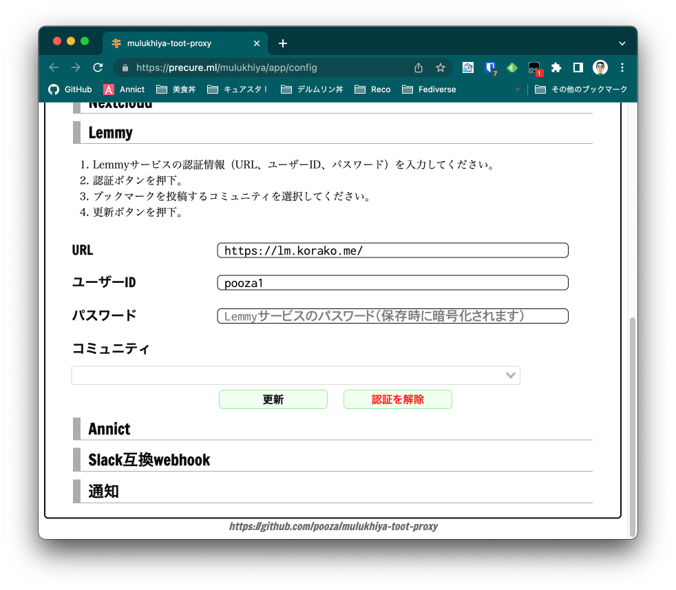 ここまでの設定で、デルムリン丼で保存したブックマークがPieFedにも残せるようになります。